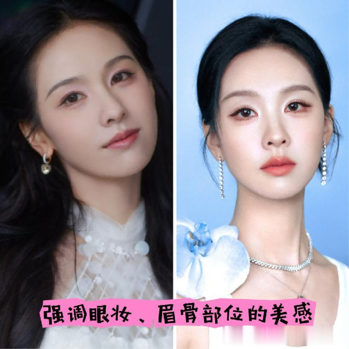 ❷ 且强调眼妆、眉骨部位的妆容美感