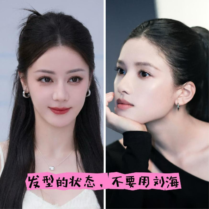 而且如果你是属于这样的长相,那么不管你的年龄阶段在什么时候都千万不要加入刘海元素的运用,因为这样的绝对优势其实就应该大大方方的将其展露出来是最好的。所以不管是丸子头还是马尾辫,大家都尽量要让我们的整个面部以及五官的状态大方的展露出来。